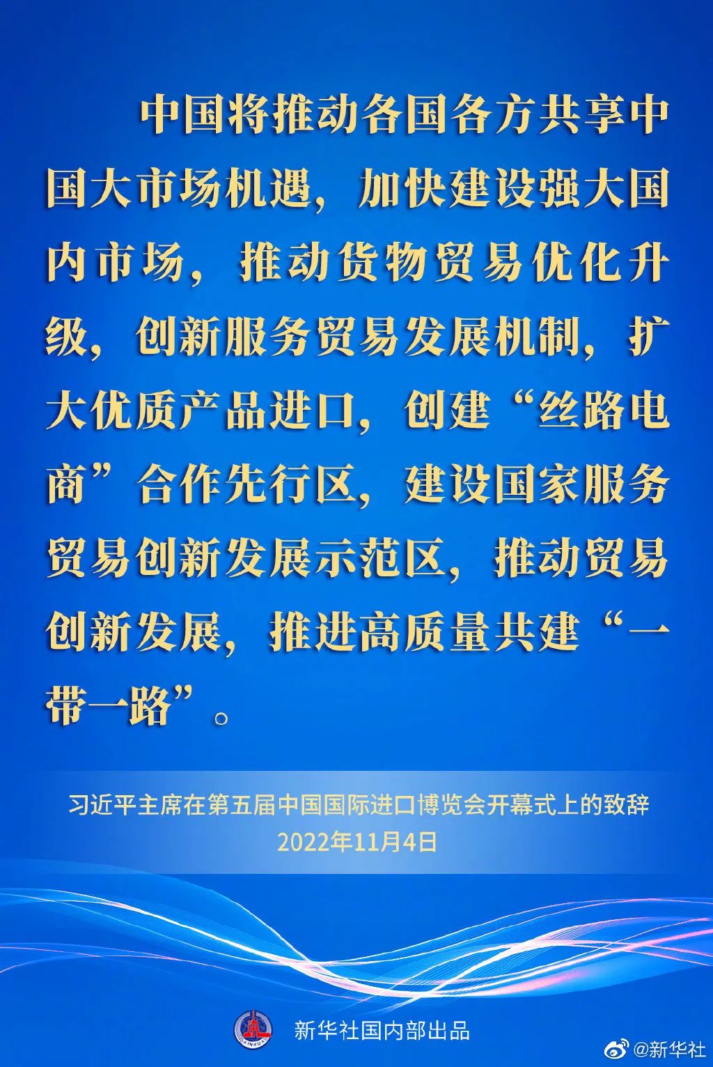——中國將推動各國各方共享中國大市場機遇,加快建設(shè)強大國內(nèi)市場,推動貨物貿(mào)易優(yōu)化升級,創(chuàng)新服務(wù)貿(mào)易發(fā)展機制,擴大優(yōu)質(zhì)產(chǎn)品進(jìn)口,創(chuàng)建“絲路電商”合作先行區(qū),建設(shè)國家服務(wù)貿(mào)易創(chuàng)新發(fā)展示范區(qū),推動貿(mào)易創(chuàng)新發(fā)展,推進(jìn)高質(zhì)量共建“一帶一路”。