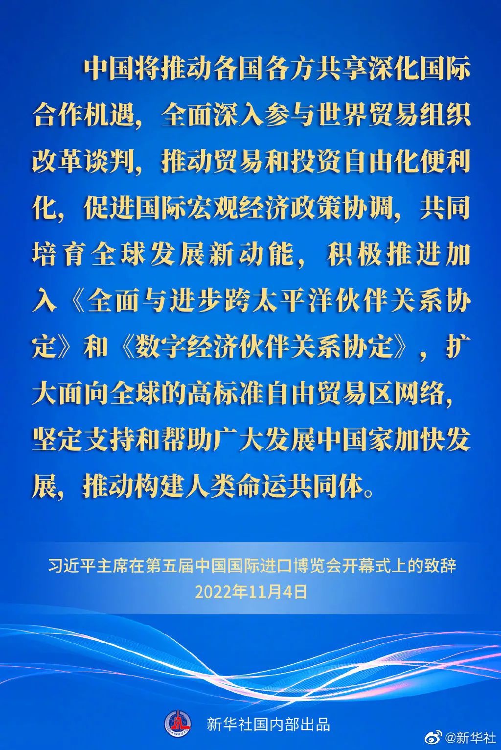 ——中國將推動各國各方共享深化國際合作機遇,全面深入?yún)⑴c世界貿(mào)易組織改革談判,推動貿(mào)易和投資自由化便利化,促進(jìn)國際宏觀經(jīng)濟政策協(xié)調(diào),共同培育全球發(fā)展新動能,積極推進(jìn)加入《全面與進(jìn)步跨太平洋伙伴關(guān)系協(xié)定》和《數(shù)字經(jīng)濟伙伴關(guān)系協(xié)定》,擴大面向全球的高標(biāo)準(zhǔn)自由貿(mào)易區(qū)網(wǎng)絡(luò),堅定支持和幫助廣大發(fā)展中國家加快發(fā)展,推動構(gòu)建人類命運共同體。