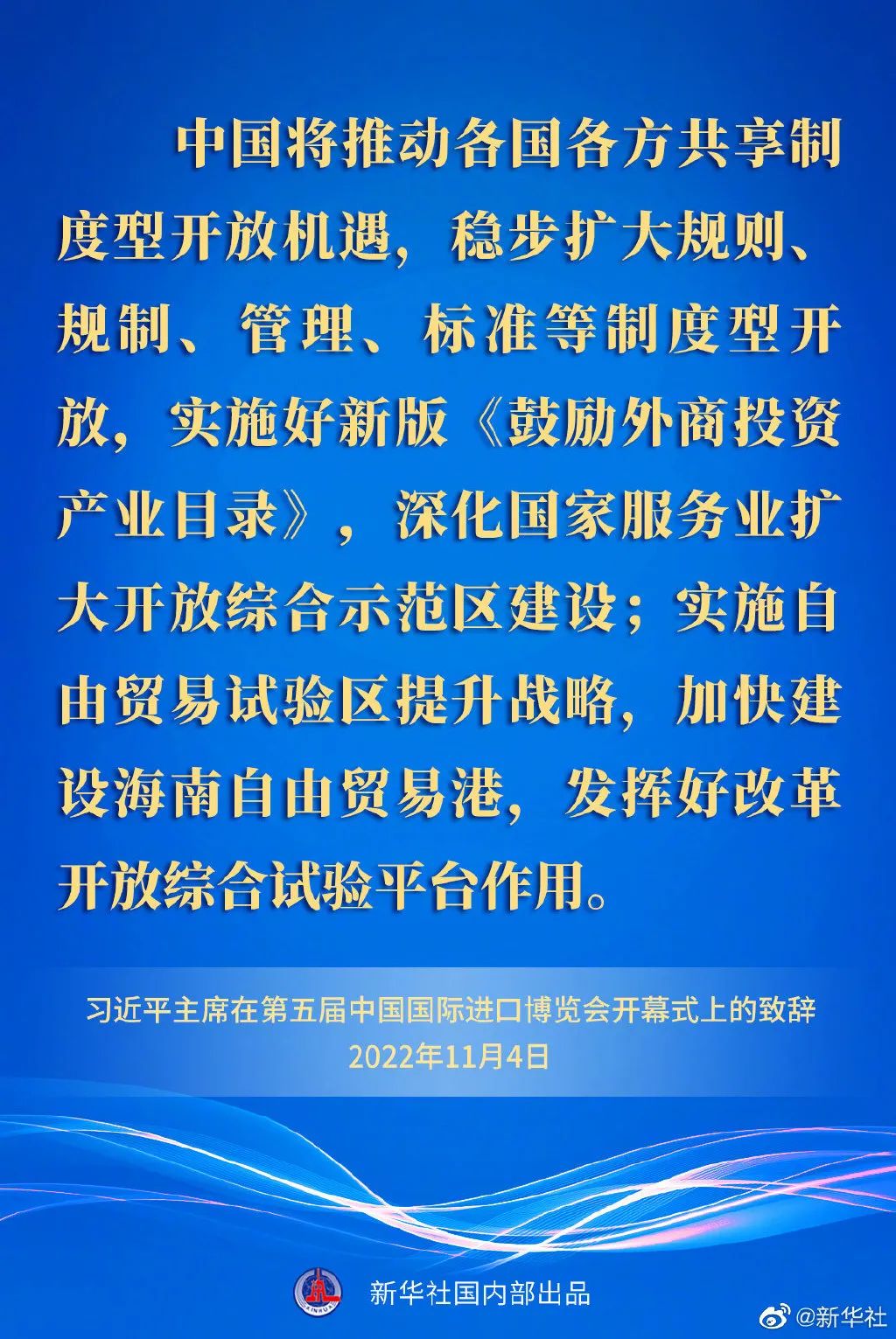 ——中國將推動各國各方共享制度型開放機遇,穩(wěn)步擴大規(guī)則、規(guī)制、管理、標(biāo)準(zhǔn)等制度型開放,實施好新版《鼓勵外商投資產(chǎn)業(yè)目錄》,深化國家服務(wù)業(yè)擴大開放綜合示范區(qū)建設(shè);實施自由貿(mào)易試驗區(qū)提升戰(zhàn)略,加快建設(shè)海南自由貿(mào)易港,發(fā)揮好改革開放綜合試驗平臺作用。