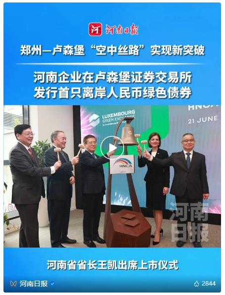 當(dāng)?shù)貢r(shí)間6月21日上午,中豫航空集團(tuán)以河南航投為主體發(fā)行的3年期人民幣境外債券上市儀式在盧森堡證券交易所舉行。這是中國(guó)企業(yè)在歐洲發(fā)行的首只支持可持續(xù)航空燃料(SAF)的綠色債券,也是河南企業(yè)發(fā)行的首只離岸人民幣綠色債券,鄭盧“空中絲路”資金融通實(shí)現(xiàn)新突破。