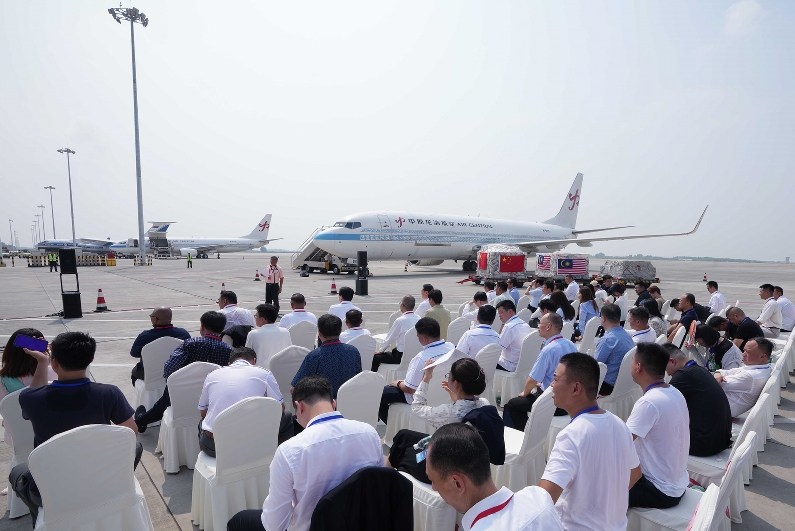 8月25日上午,吉隆坡-鄭州鮮食榴蓮首航接機(jī)儀式在鄭州機(jī)場舉行,馬來西亞首批鮮食榴蓮進(jìn)入中國市場,中馬航空貨運樞紐項目加速推進(jìn)。中豫航空集團(tuán)黨委書記、董事長張明超,總經(jīng)理、黨委副書記、副董事長柳建民;馬來西亞駐華大使館工作人員,馬來西亞榴蓮廠商公會代表和榴蓮貿(mào)易供應(yīng)鏈企業(yè)代表參加了儀式。
