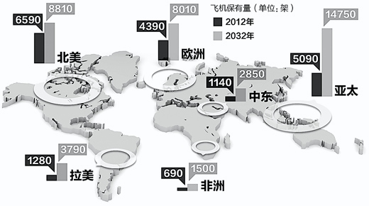 根據(jù)波音公司的預(yù)測,未來20年全球民機市場規(guī)模將翻一番,新興市場成為增長主動力。到2032年,全球?qū)⑿略龀^3.5萬架飛機,總額高達(dá)4.8萬億美元。亞太市場增幅最大,將新增1.282萬架飛機,總額1.89萬億美元。其中,中國市場發(fā)展最為迅速??湛凸究偛眉媸紫瘓?zhí)行官密法布里斯·布利葉認(rèn)為,中國航空業(yè)的迅速發(fā)展是中國經(jīng)濟社會發(fā)展的必然產(chǎn)物,中國航空業(yè)發(fā)展的年均增速約為10%,同期全球航空業(yè)的增速則為5%。在未來20年,中國將成為世界最大的航空市場。